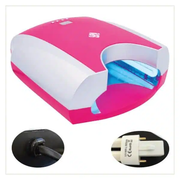 Exklusive UV Lampe (4x9W). Farben Pink, Beige und Schwarz, mit starkem Lüfter, Timer und einfacher digitaler Programmierung durch 4 Taster, die der Modellistin zugewandt sind. An der Innenseite komplett verspiegelt. Ideale Form auch für die Füße. Sehr strapazierfähig.